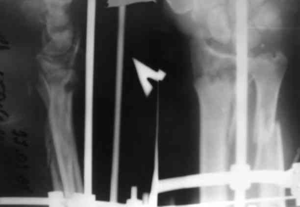 Через 3 дня переведен в травм.отделение. Мнения коллег о дальнейшей тактике разделились: накостно с трансплантацией или ЧДО аппаратом Илизарова, с целью добиться, хотя бы относительно удовлетворительного стояния.На сегоднешний день выраженный болевой синдром, больше слева.Раны на предплечье заживают первично.