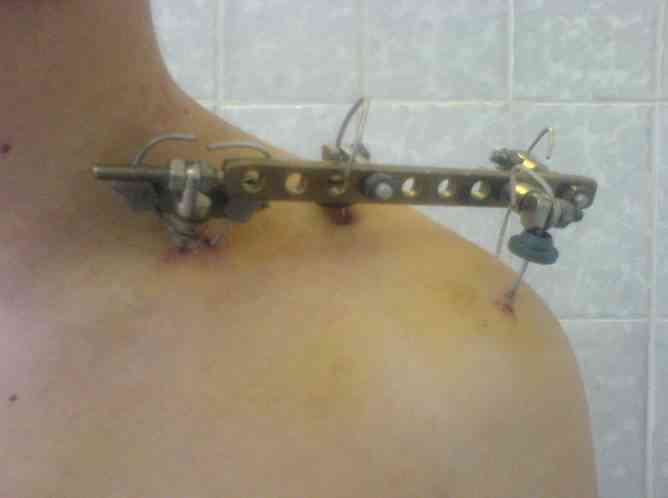 К сожалению оригинального аппарата Сушко нет в наличии (даже в глаза не видел), но использовался сам принцип метода по Сушко-Илизарову. Цитирую из "Основ по чрезкостному остеосинтезу аппаратом Г.И. Илизарова" (Л.Н.Соломин, 2005): 1. В каждый костный фрагмент должно быть введено не менее двух 2-мм консольных спиц, расположенных под углом к друг другу. 2. Места введения спиц должны располагаться вблизи суставных концов ключицы.