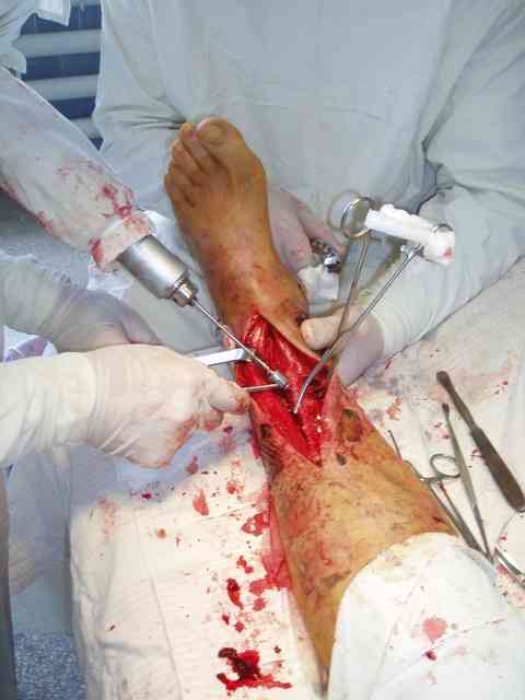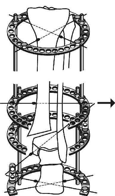 Проксимально я бы использовал только одну спицу, чтобы позволить ротацию. Дистально - пяточный бугор в области прикреплекния ахилла и шейку тарана. Я бы использовал или спицы с оливаи или минимальную внутреннюю фиксацию для "хороших фрагментов" и позволил и дистракцию, и ротацию вокруг стержней дистрактора.(Перевод АЧ)
