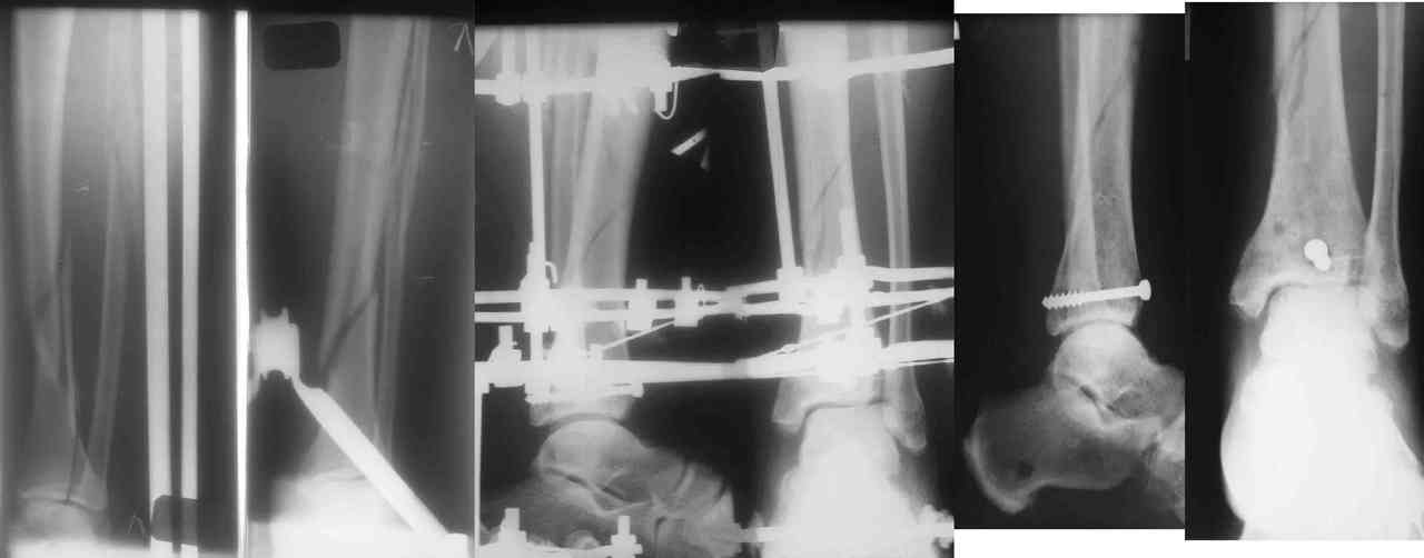 Мне кажется, недостаточно последних ренгенограмм для оценки состояния сустава, необходимы стандартные (прямой, боковой и мортиз) снимки голеностопного сустава, и снимки надо сделать с укладкой на голеностоп, а не голень.