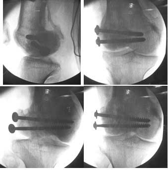 This was fixed temporarily, bone grafted with tricortical struts, and fixed by two cancellous screws. The fragment was not large enough to afford any fixation to a plate or such implant, and the screws held it compressed well to the rest of the distal femur.