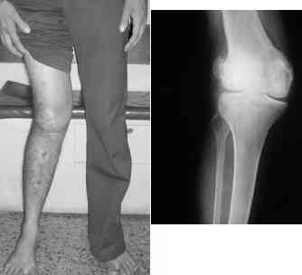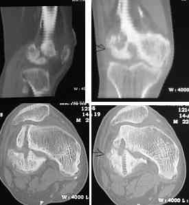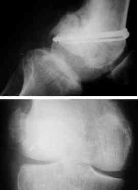 This 20 year old patient sustained a fracture in the lower end of the femur, one and a half years ago, with a compound wound over the fracture area. Notes at that time mention a compound fracture dislocation, with a loss of part of the lateral condyle. This was treated by debridement, and external fixation. After two weeks, the lateral condyle (coronal fracture) was fixed by a screw and k wire in an AP direction.