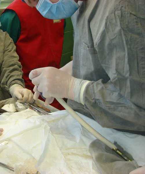 Неожиданные сложности технического плана возникли у нас при изготовлении спейсера. Дело в том, что до операции в нашем институте мы не смогли найти силиконовую трубку с внутренним диаметром 14 мм. Были лишь трубки с просветом величиной 12 мм и менее. Мы сочли это недостаточным, так как в таком случае толщина слоя цемента на штифте составляла бы только 1,5 мм и он мог бы растрескаться при забивании. Трубки необходимой толщины были найдены в фирме, торгующей оборудованием для пищевой промышленности. Органолептически они ничем не отличались от наших трубок для дренажей, были пригодны для стерилизации. Но, во время операции после застывания цемента стенка трубки очень плохо отделялась от поверхности цемента. Пришлось использовать распатор и циркулярную фрезу. Видимо силикон, из которого эти трубки изготавливаются, отличается от медицинского.