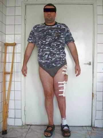 В остальном, операция прошла без технических трудностей. Александр Николаевич, спасибо за ваши прекрасные развертки. Так не хочется отдавать их Вам обратно! Завтра пациент выписывается. Температура тела и анализы у него нормальные. Бедро мягкое, отечность тканей значительно уменьшилась. Послеоперационные раны зажили первичным натяжением. Укорочение конечности составляет 1,5 см (по ощущениям больного, это оптимальная длина ноги для него, так как у него анкилоз коленного сустава и голеностопного сустава в положении подошвенного сгибания). Пациент ходит с дозированной нагрузкой на конечность (10% от веса тела). Свищ на передне-наружной поверхности средней трети бедра, который открылся за неделю до последней операции рядом со стержнем аппарата, закрылся 5 дней назад (рис. 6,7, 8).