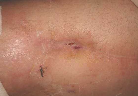 >Свищ на передне-наружной поверхности средней трети бедра, который открылся за неделю до последней операции рядом со