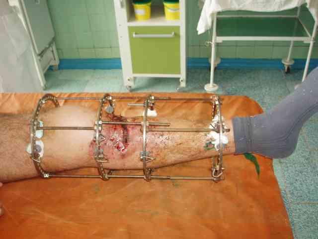 В проксимальный эпиметафиз большеберцовой ввели бы 4-5 спиц с упорами