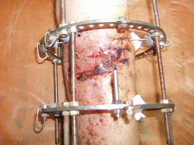 А что делать дальше, когда вывалится некроз, как раз понятно - некрэктомия, сегментарный костный дефект, закрываются мягкие ткани (грануляции, свободная пластика, можно несвободную, cross-leg), потом замещать дефект кости удлинением одного из отломков.