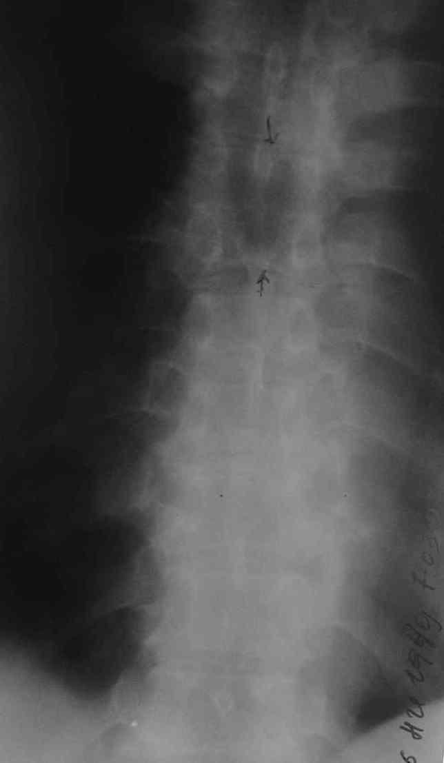 в ОРиТ с подозрением на острое нарушение спинального кровообращения. на выполненных рентгенограммах (15 марта) обнаружена деструкция тел грудных позвонков. Все дальнейшие обследования в условиях районной больницы были направлены на исключение или подтверждение мт или тубпроцесса в