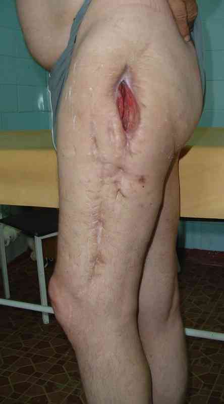 Ложный сустав шейки левой бедренной кости. Укорочение левого бедра 10 см. Контрактура коленного сустава. Жалобы: боли в области левого бедра, коленного сустава, нарушение функции левой ноги, наличие свища с гнойным отделяемым в левой подколенной области, свища в области в\з бедра. Анамнез: в 1975 г. получил закрытый перелом с\з левой бедренной кости. Оперирован в районной больнице - выполнена открытая репозиция, интрамедуллярный остеосинтез. Осложнение - нагноение раны с исходом в остеомиелит бедренной кости. В последующий годы - трижды патологический перелом бедра. Оперирован за эти годы около 30 раз по поводу обострения остеомиелита. За последние 5 лет обострения ежегодно по 2- 3 раза в год. Динамика отрицательная. Рентгенологически - тотальное поражение бедренной кости. Объективно: передвигается при помощи костылей с дозированной нагрузкой на левую ногу. При нагрузке на левую ногу - стопа в положении эквинуса, опора на передний отдел стопы. Выражена атрофия мышц левого бедра, голени. На всем протяжении бедра - множественные рубцы после оперативных вмешательств. В в\з бедра по наружной поверхности - грубый втянутый рубец с вялогранулирующей раной на дне его. Отделяемого нет. В области подколенной ямки - свищ с гнойным отделяемым серо - зелоноватого цвета без запаха. Укорочение бедра 10 см. Движения в тазобедренном суставе активно 180 - 160 град., пассивно 180 - 90 град. В коленном уставе 178 - 110 град. Чувствительных расстройств конечности нет. Лабораторные данные: Общ. ан. крови: 20.04.07. Нв-135 г\л, Er 4.22 млн., Le-9.7 тыс, Эоз. 4%, Пал.-5 %, Сегм.-60 %, Лимф. - 25 %, Моноц.-6 %, СОЭ 51мм\час. Биохимический ан. крови от 20.04.07г. Белок -77 г/л, сахар крови 5.38 ммоль/л., билирубин 10.2 мкмоль/л. Тимоловая проба 2.5 ед.пом. Ан.мочи от 20.04.07. : отн. плотность1026, белок - отр, сахар -отр, ЭКГ от 22.02.07 : отклонение ЭОС влево.. Неполная блокада правой ножки пучка Гиса. Флюорография от 28.12.2006 года № 038 - без патологии. R - графия : грубая деформация и склерозирование бедренной кости от проксимального до дистального метафиза , множество очагов просветления в области дистального метаэпифиза, н\з бедра. МРТ коленного сустава, н\з бедра от 21.04.2007г. - картина хронического остемиелита левой бедренной кости. Имеется полость деструкции в дистальном метадиафизе протяженностью до 12 см. Полость имеет неоднородное содержимое за счет гноя, грануляций, секвестров, сообщается со свищевым ходом, идущим в подколенную ямку.
