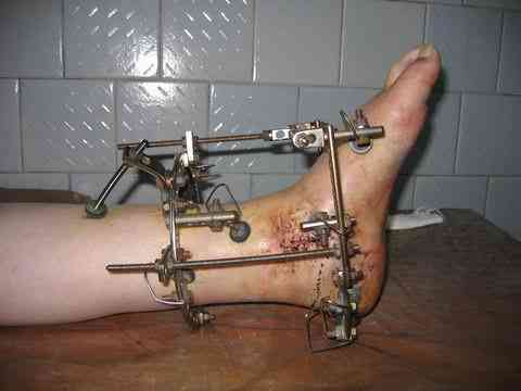 Погрешности мелкие, на исход лечения вряд ли повлияют. Но все же. По-моему не одинаковые кольца, не корректно введенный согнутый стержень Шанца, проксимальные чрескостные элементы расположены на одной опоре (база на голени вполне могла бы быть из двух колец) и совсем мелкие замечания - грубо загнутые не скушенные концы спиц, местами не отмытая скорее всего с момента операции с конечности и аппарата кровь.