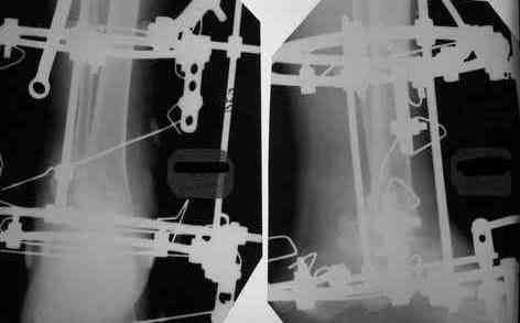 Уважаемые коллеги. Тема обсуждалась: Прошу прощения за задержку с ответом. Женщину прооперировал. Из внутреннего доступа удалена внутренняя лодыжка, из наружного отсечена от рубцов латеральная, из обоих параллельно предыдущей остеотомии экономно произведена резекция "суставных" поверхностей ББК и тарана до "кровавой росы", удалены все рубцы, стопа выведена, провизорная диафиксация спицами. Далее аппарат, однако, после удаления диафиксирующих спиц и компрессии, произошло наружное смещение тарана. Но и так время операции составило почти 4 часа, поэтому через неделю пришлось маленько подработать аппаратом. Итог на снимках (извиняю сь за качество). Не совсем все нравится - в литературе намного красивее. Только один вопрос к уважаемому форуму: что действительно необходимо подправить? Спасибо. С уважением, А.Минервин.