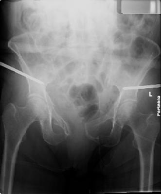 2. Авто, 35 лет, М, 160 кг: разрыв лона, крестец, бедро, разрыв брыжейки. В области: экстренная лапаротомия, резекция тонкой кишки. На 8-е сутки переведен к нам. Через два дня остеосинтез бедра штифтом, еще через два дня ТЭЛА, перевод в сосудистое, кавафильтр, пневмония... До таза добрались к 6-ой неделе. Ex-fix, была невозможна из-за огромного живота. После нижне-срединной лапаротомии нижний угол раны гноился и так и не зажил к этому времени. Итак: фиксация симфиза двумя пластинами - гематома -ревизия - вторичное заживление раны,: Сформировался свищ с очень скудным отделяемым (MRSA). Через два года иссечен свищ, удален металл. Все зажило, бегает.