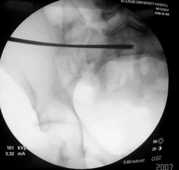 Сверло-направитель в 3.2 мм проводится вручную без применения дрели, и длина в 46 см обычно достаточна до захвата следующего илио-сактрального сочленения.