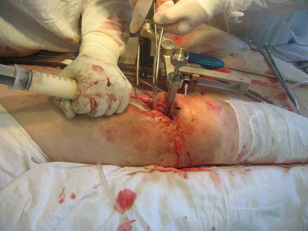 В связи с проблемами снабжения операция выполнена в два этапа.1. некрэктомия, операционная биопсия. Резекцию концов отломков ни производили, их костная плотность не изменена. Почистили канал, промыли, ушились. 2. Пломбировка дистального отломка цементом, синтез сплошным титановым гвоздем. Гвоздь подобрали максимально возможный 12 мм, рассверлили дистальное отверстие для винта 6.5мм. Приготовили пробку из цемента с антибиотиком ванкомицином(примерно 0.5г на 20г цемента). Дождавшись пластилиновой консистеции цемента установили пробку в канал дистального отломка, затем ввели гвоздь. Приготовили каналы для блокирования винтами, Р-контроль, выкрутили винты. В полость патологического перелома ввели трубки для нагнетания цемента. цемент 40г замешали с ванкомицином 1.5г, жидким залили в шприц Жане и ввели в полость перелома, закрутили блокирующие винты. На этот раз проблем с замешиванием цемента не было, запаслись растворителем. Половина цемента осталась. Функциональный результат пока неизвестен, как и результаты биопсии. Постараюсь держать в курсе.