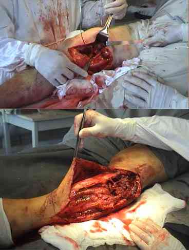 При поступлении - первичная хирургическая обработка открытых переломов голени и бедра, остеосинтез КДА МКЦ справа, КДА Илизарова слева. На операции - отслойка по медиальной и латеральной поверхности правого бедра до 3,5%, обширное повреждение m.tibialis anterior, peroneus longus, extensor digitorum longus с сохранением анатомической целостности N.peroneus communis. В послеоперационном периоде анемия (эр-2.12 нт-0,17 нв-61). Формирование кожных некрозов в зоне медиальной и латеральной поверхности правого бедра и латеральной поверхности левой голени по сухому типу к 12 суткам. А\б цефтриаксон по 2.0 в\в , амикацин 1.5 в\в. Планируется - учитывая расположение дистальных стержней КДА МКЦ в зоне некроза демонтаж аппарата на бедре, скелетное вытяжение на 3-4 дня с последующим выполнением антеградного остеосинтеза стержнем ChM. Принимая во внимание обширность повреждения мягких тканей на голени смена типа фиксации не планируется. Вопрос: Мы планируем в ходе одной операции на бедре выполнить некрэктомию, далее остеосинтез, провести блокирующие дистальные винты через раневую поверхность(после некрэктомии) и -дерматомная аутопластика. Правомочен ли, по вашему мнению, подобный операционный план? Какими антибиотиками рекомендуете осуществлять профилактику? Каков рекомендуемый обьем послеоперационной нагрузки на ногу с учетом повреждения на бедре mm. gracilis, sartorius, vastus medialis и малоберцовой кости в в\3 правой голени? Прилагаем интраоперационные фотографии бедра и голении, рентгенограммы правого бедра, фотографии бедра и голени на 10 сутки.