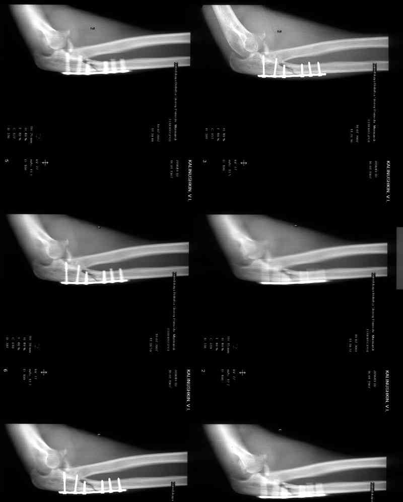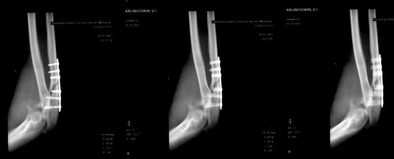 через 3 мес. Отмечается контрактура локтевого сустава, сгибание/разгибание 30/0/0.