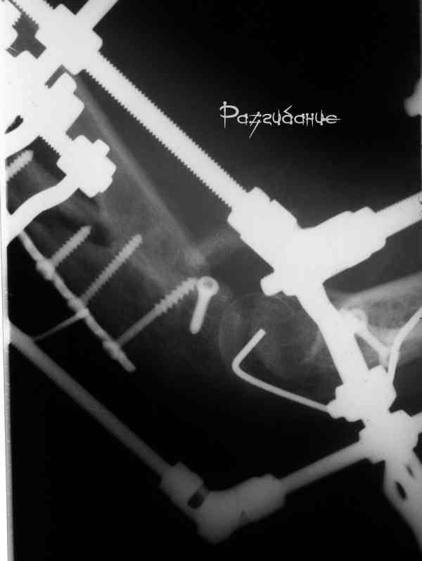 Естественно ревизия сустава и удаление рубцово-хрящевидных тканей.Затем наложили аппарат Илизарова с шарнирами. Первые 2 дня сустав был фиксирован трансартикулярно 2-мя спицами, затем спицы удалили. И больной начинает движения в аппарате.