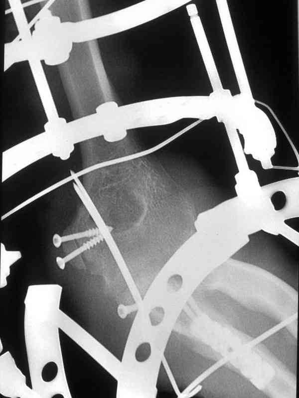 > тканей.Затем наложили аппарат Илизарова с шарнирами.