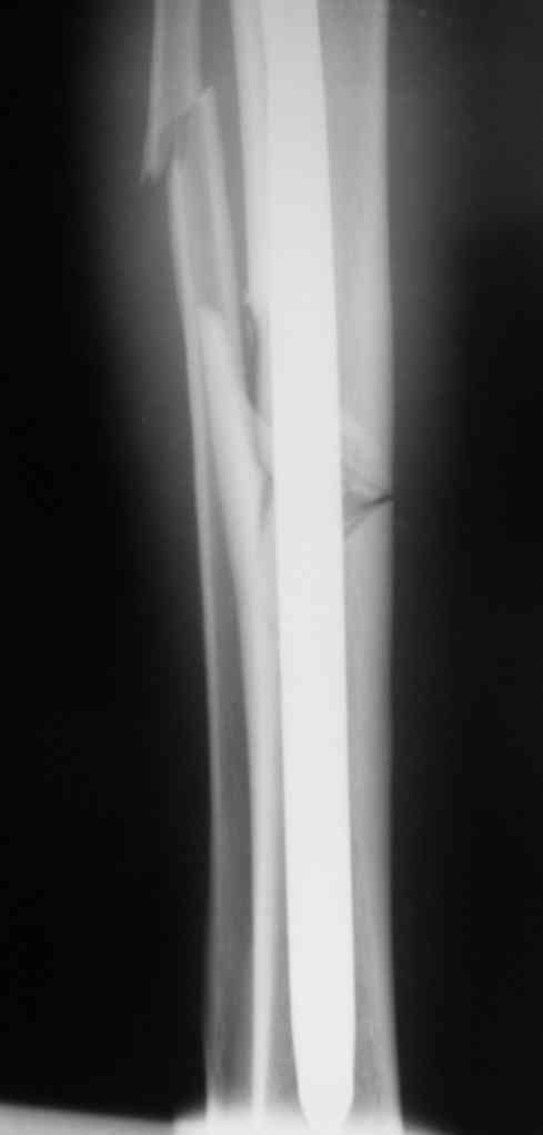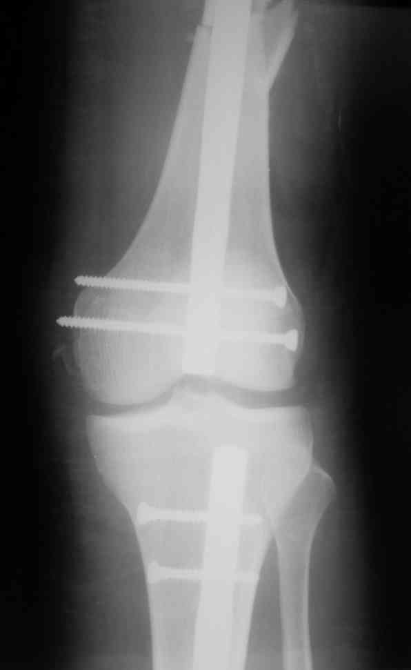 OBJECTIVE: To report the results of using the expandable nailing system in the treatment of femoral and tibial shaft fractures. DESIGN: Prospective, cohort series. SETTING: Two level-1 university trauma centers. PARTICIPANTS: Forty-eight patients with acute, traumatic diaphyseal fractures of the tibia or femur. INTERVENTION: Internal fixation of lower extremity long bone fractures using expandable intramedullary nailing. MAIN OUTCOME MEASUREMENTS: Perioperative complications and time to healing. RESULTS: Forty-nine long bone fractures were treated: 22 femoral fractures (OTA classification: 4 type A1, 6 A2, 7 A3, 1 B1, and 4 B2) and 27 tibial fractures (OTA classification: 4 type A1, 11 A2, 9 A3, 0 B1, and 3 B2). There were 13 open fractures and 37 closed fractures. Healing occurred in 37 (75%) fractures without additional interventions. There were 2 tibial delayed unions and 1 femoral and 1 tibial nonunion. Five tibial shaft fractures and 6 femoral fractures shortened by 1.0 cm or more postoperatively. In 3 tibias and 4 femurs, shortening occurred after fractures judged to be length-stable became unstable because of fracture propagation during nail expansion. Five tibias and 3 femurs were converted to standard locked nails because of shortening. The average time to healing, excluding nonunion, was 15 weeks in the tibia and 16 weeks in the femur. The expandable nail resulted in an unplanned reoperation in 12 cases (25%). CONCLUSION: We found a high complication rate because of shortening, which was independent of fracture classification. Consequently, we cannot recommend the use of an unlocked, expandable nail in diaphyseal fractures of the femur or tibia.