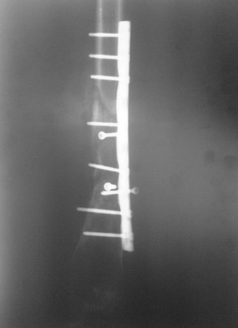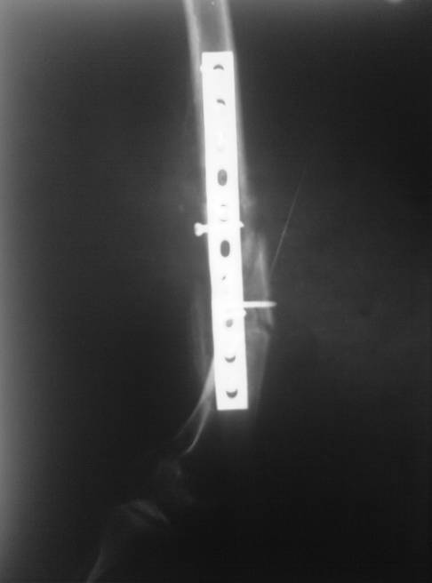 Через 4 месяца стали беспокоить боли и деформация бедра. На снимке угловая деформация AP - варус 11 град.; lateral - 29 град. Объем движений в коленном суставе: ограничение сгибания до 90 град. Локально - патологическая подвижность в нижней трети бедра. Локальная гипертермия, отек мягких тканей. Гиперемии нет. Передвигалась на костылях. В мае 2007 года оперирована в Уральском НИИТО г. Екатеринбурга. Выполнено: полузакрытое удаление пластины и винтов, IM блокируемый остеосинтез.