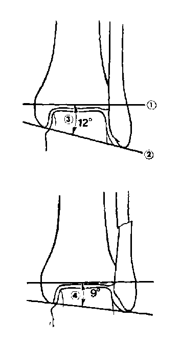 Известно, что укорочение наружной лодыжки при ее переломе можно лучше всего оценить тщательно измеряя и сопоставляя talocrural угол на пострадавшей и здоровой стороне. Различие, более чем в 2 ° указывает на то, что вилка сустава не восстановиться для нормального функционирования сустава. Измерение и восстановление talocrural угла основано на факте, что fibula является ключом голеностопного сустава. Ротационное и продольное смещение отломков fibula должно быть точно устранено для того, чтобы восстановить конфигурацию вилки. Talocrural угол сформирован пересечением двух линий: первая - проведена параллельно суставной поверхности большеберцовой кости; вторая - через вершины лодыжек. Этот угол в норме варьирует от 8 до 15 градусов.