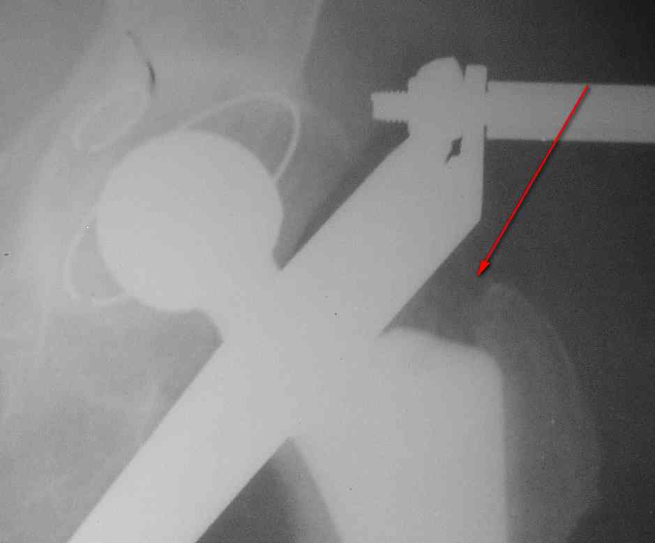 Видимо, тут надо добиваться точной репозиции этой спирали вдоль протеза, чтобы воссоздать ложе для ножки.
