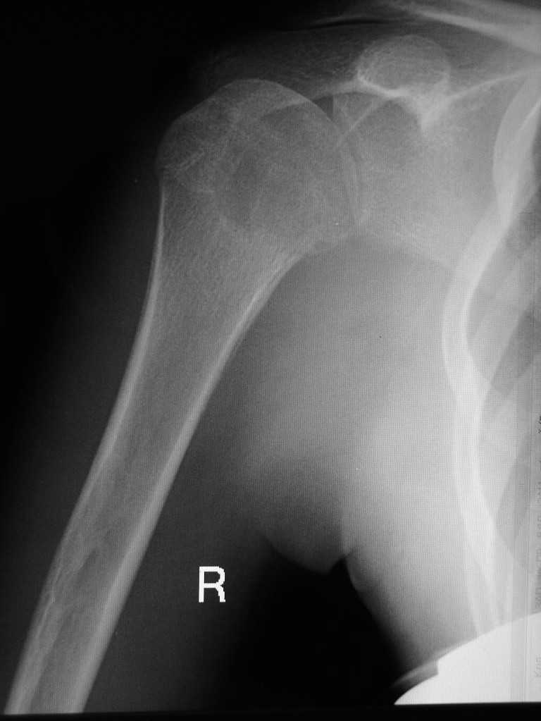 Здравствуйте уважаемые коллеги. Прошу помочь определится с диагнозом. Девушка 16 лет, в течении 10 мес. беспокоят боли в правом плечевом суставе. Последних два месяца возникло резкое ограничение подвижности в суставе. Со слов больной и родителей месяц назад проходила курс лечения у травматолога с диагнозом "периартрит". На момент осмотра плечо отведено до 40 град., активные и пассивные движения резко ограничены, болезненны. Кожные покровы не изменены, пальпация сустава болезненна, общ. ан. крови - норма. Снимки прилагаю. Заранее благодарен за помощь.