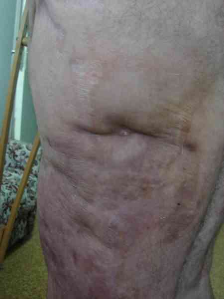 В настоящее время наш пациент ( см. http://weborto.net/forum/1177351385/) ходит с одним костылем. У него периодически открывается свищ на задне-наружной поверхности бедра с умеренным серозно-гнойным отделяемым. Температура тела и анализы нормальные. На рентгенограммах имеются признаки консолидации ложного сустава.