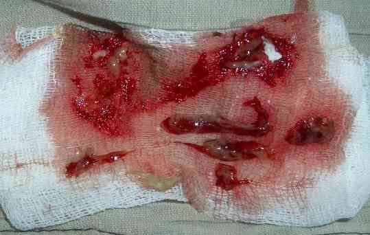 1, 2 - вид бедра на операции (имеется гнойное отделяемое из свища в верхней трети бедра);