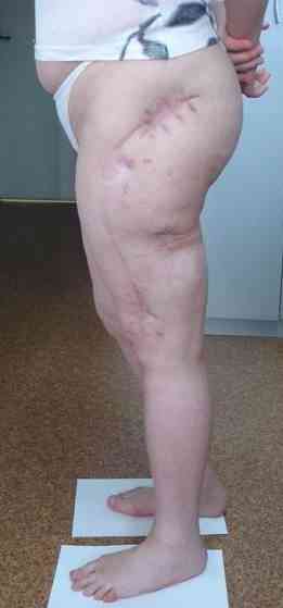 В качестве демонстрации лечения канального остеомиелита бедренной кости представляем пациентку (см. parts 2 и 3), которая как раз сегодня была у нас на контрольном осмотре. В мае этого года мы произвели ей фиксацию бедренной кости штифтом-спейсером по поводу ложного сустава и канального остеомиелита бедренной кости. Через 4 недели после операции свищи закрылись. Сейчас она ходит с полной нагрузкой на конечность.