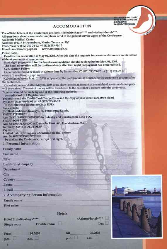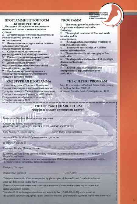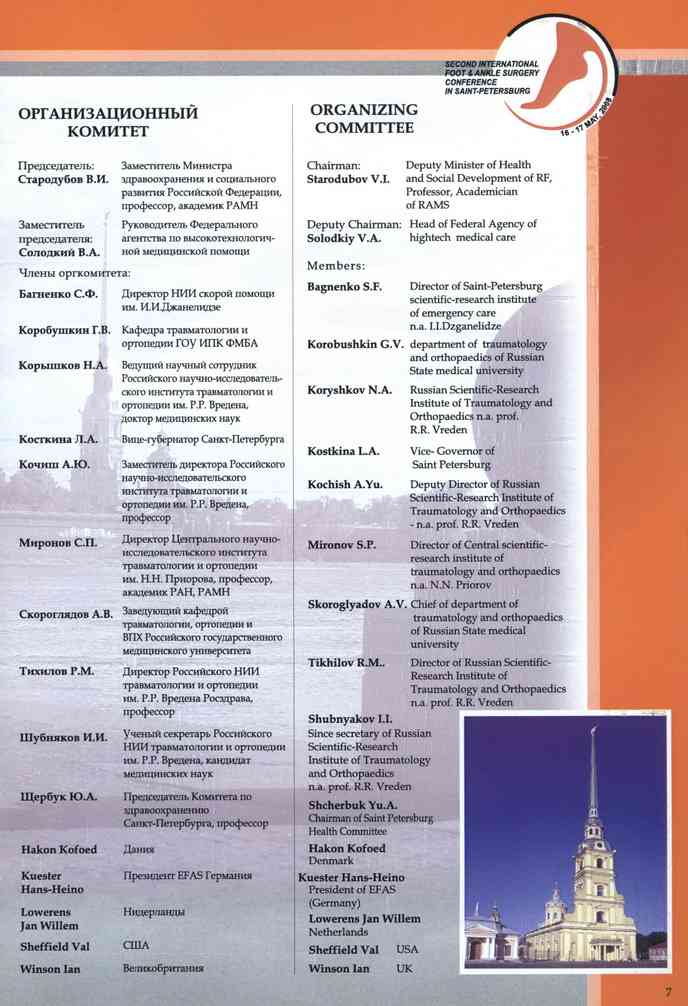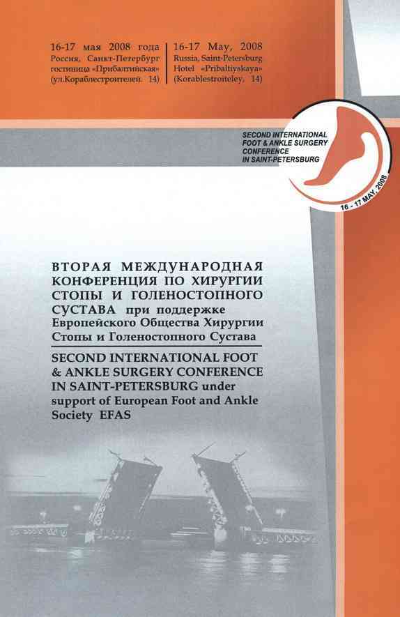 Уважаемые коллеги! Рад сообщить Вам о том, что в Санкт-Петербурге 16-17 мая 2008 года состоится Вторая международная конференция по хирургии стопы и голеностопного сустава, при поддержке Европейского общества хирургии стопы и голеностопного сустава (EFAS). ПРОГРАММНЫЕ ВОПРОСЫ КОНФЕРЕНЦИИ: 1.Методики обследования пациентов с патологией стопы и голеностопного сустава. 2.Хирургическое лечение травм стопы и голеностопного сустава, а также их последствий. 3.Диагностика и хирургическое лечение заболеваний стопы и голеностопного сустава. 4.Современные возможности реконструкции Ахиллова сухожилия. 5.Реконструктивная микрохирургия стопы и голеностопного сустава. 6.Диагностика и лечение онкологических заболеваний стопы и голеностопного сустава. 7.Проблемы артродезирования и эндопротезирования голеностопного сустава и суставов стопы. Приглашаю принять участие всех желающих в этом интересном мероприятии. Тезисы докладов объемом до двух страниц машинописного текста (1800 знаков, через 1,5 интервала в программе Microsoft Word, шрифт Times New Roman №14), с подписью авторов и визой руководителя учреждения "к печати" будут приниматься до 30 декабря 2007 г. Их можно отправить по электронной почте на адрес footsurgery@mail.ru и продублировать по адресу: 195427 Санкт-Петербург, ул.Акад.Байкова, д.8, ФГУ РНИИТО им.Р.Р.Вредена Росмедтехнологий, организационно-методический отдел. Дополнительная информация в приложении. < | >