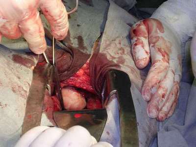 Правый плечевой сустав умеренно деформирован. По внутренней поверхности плеча имеется кровоподтек. При пальпации плечевого сустава имеется умеренная болезненность. Активные и пассивные движения болезненные. Снижена чувствительность по тыльной поверхности пальцев кисти и отсутствует активное разгибание кисти и пальцев. Имеется подкожная эмфизема шеи, верхней половины грудной клетки (рис 1, 2). На рентгенограмме: оскольчатый перелом головки плечевой кости со значительным смещением, перелом 2-3 ребер справа, тканевая эмфизема (рис 3). КТ при поступлении: перелом головки плечевой кости в области анатомической шейки со смещением отломка головки в грудную полость, правосторонний гидроторакс, перелом 2-3-4 ребер справа. (рис 4). Через двое суток после поступления выполнена операция: атипичная торакотомия, эвакуация свернувшегося гемоторакса, удаление инородного тела (головки плечевой кости) из плевральной полости (при этом выявлено имеющееся повреждение париетального и висцерального листков плевры) (рис. 5), дренирование плевральной полости, замещение проксимального конца плечевой кости спейсером из костного цемента с антибиотиком (рис. 6). Послеоперационный период протекал гладко. При контрольной рентгенографии положение спейсера удовлетворительное (рис. 7, 8). Дренаж из плевральной полости удален через 3 суток после вмешательства. Послеоперационная рана зажила первичным натяжением. Через 12 дней после операции больной выписан на амбулаторное лечение.
