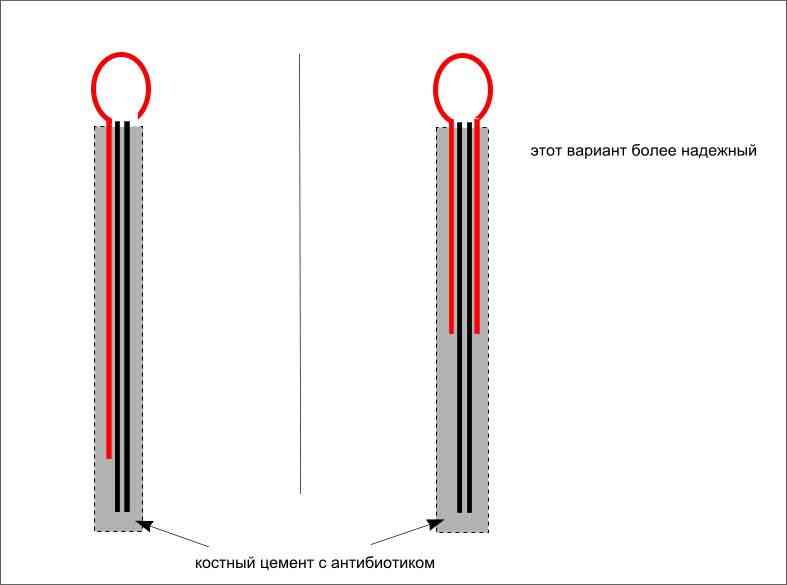 чтобы был пожиже), туда же порошок антибиотика. Мешаем. Добавляем жидкий мономер, всю ампулу. Перемешиваем. Полученную сметанообразную массу шпателем помещаем в шприц 100 мл. Его канюлю лучше укоротить. Ее вставляем в силиконовую трубку (для плеврального дренажа) с просветом 9-10 мм. Выдавливаем туда цемент. Заталкиваем вдоль 1-2 толстых спицы, чятобы кончики торчали. после полимеризации цемента разрезаем трубку вдоль и снимаем, как кожуру с банана. С дистальной стороны спицу загибаем, оставив короткий кончик, с проксимальной - делаем колечко поудобнее для последующего извлечения. Вводим спейсер в подготовленный канал.