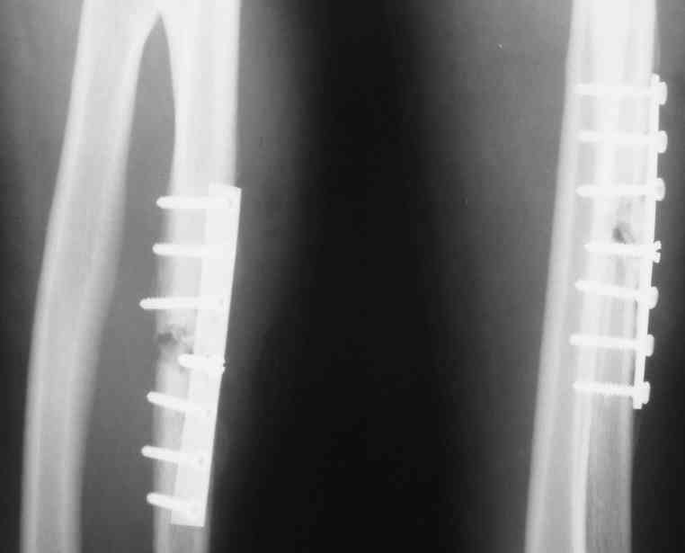 07.08.07 выполнена открытая репозиция,остеосинтез локтевой кости пластинкой.Послеоперационный период осложнился нагноением п/о раны. Выполнено дренирование п/о раны с установкой промывающего дренажа,антибиотикотерапия.Явления воспаления купированы.В настоящее время в ср/3 левого предплечья,в проекции п/о рубца, имеется рана,размерами 2,0х0,8 см со скудным гнойным отделяемым,умеренный отёк мягких тканей.Данные R-графии через 2 месяца после операции представлены. Хотелось бы узнать ваше мнение о тактике дальнейшего лечения: Целесообразно ли удаление фиксатора в данной ситуации? И если да,то альтернативный способ фиксации отломков? Объём оперативного вмешательства? Способ замещения дефекта локтевой кости? Заранее признателен,с уважением В.