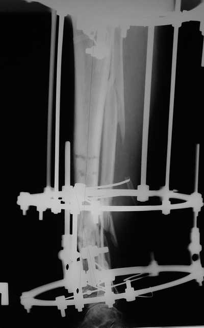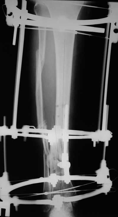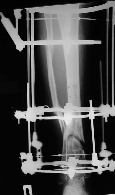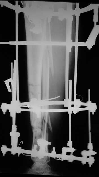 Женщина 46 лет, неудачно лечившаяся по поводу перелома голени в нижней 1\3 сначала в гипсе, поступила через 6 месяцев после остеосинтеза пластиной (рис 1). Имелась деформация в нижней 1\3 голени: варус, антекурвация, наружная ротация, два свища. Удалена пластина, дебридмент мягких тканей,