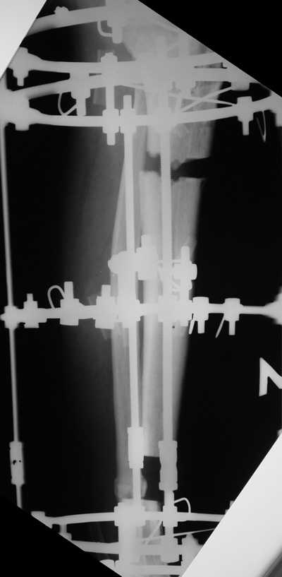 Женщина 46 лет, неудачно лечившаяся по поводу перелома голени в нижней 1\3 сначала в гипсе, поступила через 6 месяцев после остеосинтеза пластиной (рис 1). Имелась деформация в нижней 1\3 голени: варус, антекурвация, наружная ротация, два свища. Удалена пластина, дебридмент мягких тканей,