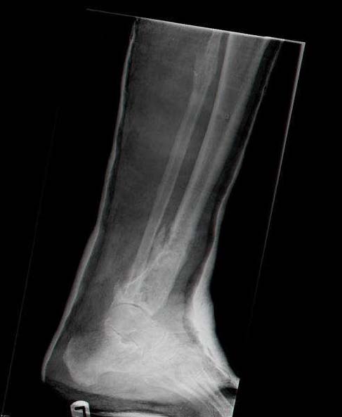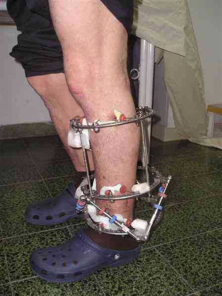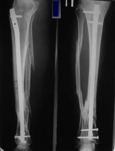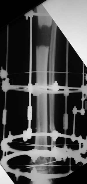 Male 54 years old, diabetic, blind in both eyes, with infected (MRSA) non union distal tibia after fracture 8 month ago. In acute phase treated by ORIF with LCP tibia and fibula. Treatment complicated by infection and after 6 month hardware was removed and treatment continued by cast fixation. You can see malposition of fragments In this stage beginning treated by Ilizarov fixation with use Hexapod system, allows anatomical position of fragments and you see signs of union.