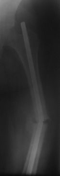 Уважаемые коллеги. Обратилась б-ная Д, 32 г с рефрактурой с/з диафиза левой бедренной кости со сломанным штифтом и с 20-ти дневным новорожденным ребенком на руках. Со слов 10.11.05 г. оперирована в БСМП , видимо произведена ОИМО штифтом ЦИТО, в то время тоже была беременной, перелом якобы долго не срастался, потом ходила с палочкой, после выкидыша повторно забеременела, поправилась на 14 кг и где-то в середине августа заметила отечность и постепенное искривление бедра, к травматологам не обратилась т.к. её цель была сначала родить ребенка. При осмотре отмечается умеренная отечность, рекурвация и варусное искривление на уровне с/з диафиза бедра, патологической подвижности явно не определяется (ну тугая), умеренная болезненность при пальпации, движения в коленном суставе почти в полном объеме . Дорогие участники форума, коллеги ! Помогите советом!1. Как удалить дистальный обломок штифта? Я знаком с материалом В. Д. Машталова, от 19.10.07г. и рекомендациями А. Н. Челнокова и A. Semenisty, но практически как это делается без рисунков или чертежей не понял, можно ли без ЭОПа делать?.2. На операц. столе одномоментное закрытое устранение деформации, рассверление к/м канала, и ЗИМО более толстым стержнем(не блокируемым)?? Надо учесть, что бедро короткое и толстое, АВФ сложно да и больная не хочет. НВ-62г/л, эритроц- 2,3млн + новорожденный ребенок. Р-снимок пока только один, б-ная отправлена гематологам. С уважением Абдурашид