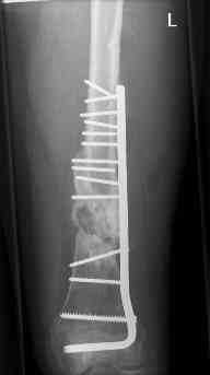 The wire track infection of external fixation is common and don’t realize the rigid fixation, so I gave up it. LC-DCP is capable of compressing the fracture, but it need the wilder strip of soft tissue.Maybe LISS is the another choice, but it also don’t compress the facture effectively.