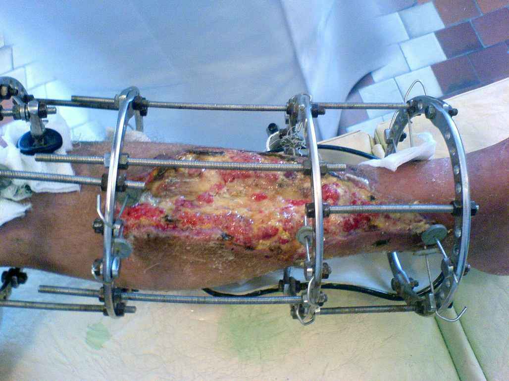 Приветствую , Ростислав ! Конечно неплохо было бы увидеть и снимки тоже . Пока , на мой взгляд , следует попытаться решить проблему мягких тканей , причём решить проблему с дерматомными лоскутами вряд ли получится , а свободный васкуляризированный лоскут с применением микрохирургической техники Вам недоступен ? Наверняка в последствии понадобятся санирующие\реконструктивные вмешательства . Кажется полезным заменить репонирующие спицы на стержни , проведенные вне зоны мягкотканного дефекта . Далее стоит наверное произвести дистракцию мягких тканей голени на спицах в поперечном направлении(попытаюсь найти картинку) и медленно устранить дефект . Второй вариант - перевести аппарат в монолатеральный и закрыть дефект несвободным лоскутом на питающей ножке . Может коллеги порекомендуют использовать вакуумные повязки ? сам , к сожалению , опыта их применения не имею