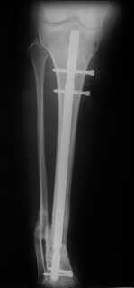 Произвели удаление проксимальной части штифта, далее рассверлили канал до 12 мм, Подвели и одели на конец отломка устройство с определенными техническими трудностями( проводник пришлось изогнуть, упиралось при входе в заднюю стенку, что значительно усложнило его последующее вращение, несколько раз удаляли устройство, т.к. полностью утрамбовывалось костной стружкой ) совместили отверстие на втулке и штифте и заблокировали отломком винта ( винт заранее надпилили по диаметру втулки и обломали после введения). Отломок удалился без проблем. Заштифтовали 11 мм реконструктивным штифтом, увы, устранить деформацию полность даже поллер винтами нам не удалось. Интраоперационно на экране ЭОпа оан выглядела не так критически, как на контрольных снимках после операции. Задним умом надо было отложить штифтование после репозиции в аппарате (прав был А.Н.Челноков!), слишком были заняты идеей удаления отломка штифта не оценив проблему устранения деформации. В п/операционном периоде разрешили дозированную нагрузку на конечность. С надеждой на критику и обсуждение С уважением к сообществу В. Машталов