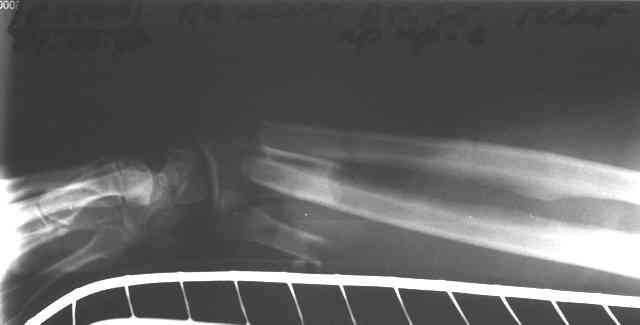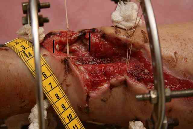 На сегодняшний день по ладонной поверхности предплечья с переходом на наружний край имеется рана с дефектом мягких тканей, выполненная грануляциями с дна и с краев. Классический Русский вопрос: ЧТО ДЕЛАТЬ? 1-й вариант: дождаться заживления раны, затем выполнить остеотомию лучевой кости, восстановить дефект в условиях аппарата ЧКДО. 2-й вариант: демонтаж аппарата ЧКДО, несвободная кожная пластика дефекта перемещенным лоскутом, накостный металостеосинтез с резекцией локтевой кости и укорочением предплечья. 3-й вариант (?): заживление, как в первом варианте, металостеосинтез, как во втором.