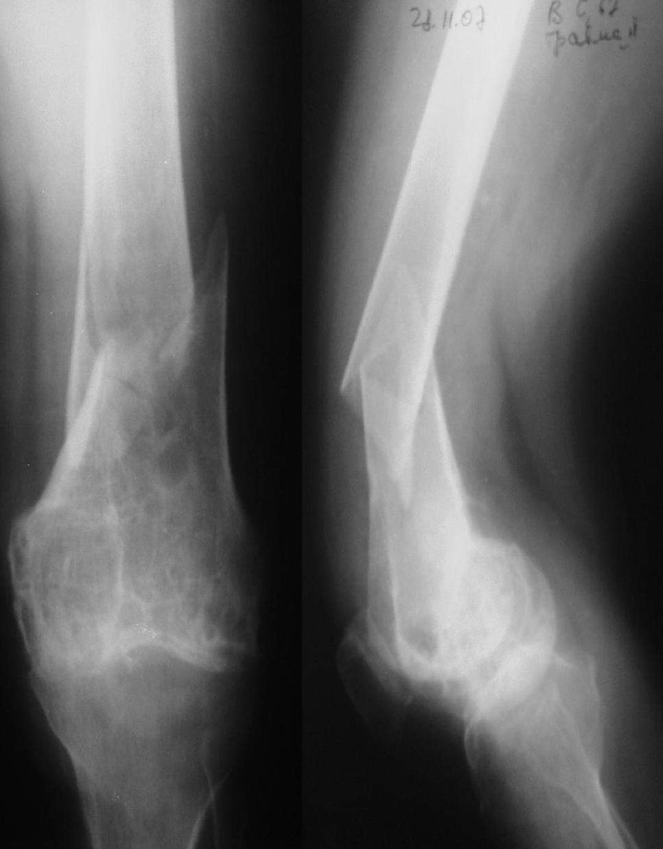 Пациентка 67 лет, поступила по скорой помощи с переломом левого бедра В 2003г оперирована по поводу рака молочной железы. В конце 2006 г появились боли в левом коленном суставе. На КТ бедра, со слов пациентки, выявлены метастазы в дистальный метаэпифиз бедренной кости. К сожалению самих снимков предоставить не может. В 2007 г, в июле больная получала курс химиотерапии. Коллеги, поделитесь вашими соображениями по поводу существующего процесса в бедре и дальнейшей тактики лечения. Заранее благодарю.