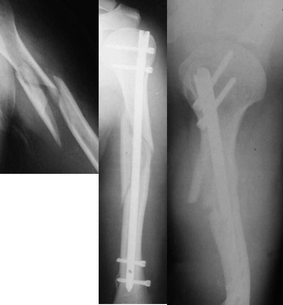 Лучевой нерв контузили скорее всего при введении нижних винтов. Коллегам доводилось встречать даже дефект лучевого нерва в результате его наматывания на сверло, поэтому в дистальном отделе плеча безопаснее вводить винты в сагиттальной плоскости.