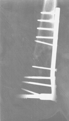 Уважаемые коллеги!!Хотелось бы узнать Ваше мнение по поводу дальнейшей тактики лечения! Пациент 11 месяцев назад получил сочетанную травму в ДТП. Самое тяжелое повреждение это закрытый многооскольчатый внутрисуставной перелом дистальной трети левой бедренной кости. Оперирован- на операции море мелких осколков, разлетелись мыщелки, произведен остеосинтез динамическим бедренным винтом с пластиной, достигнута хорошая компрессия между мыщелками, хорошее их сопоставление в суставе, и хорошая жесткая фиксация к бедру. Очень извиняюсь за качество снимка- никак не могу привести их в читабельный вид (качество их сильно хромает в госпитале). После операции долго лечили лигатурные свищи. Сейчас на контрольных рентгенограммах консолидации просто нет, в надмыщелковой зоне имеется дефект кортикала и губчатого вещества, хотя на операции все это было забито костной крошкой. И теперь что делать дальше?? Мнения такие: металлоконструкцию не менять, произвести костную пластику по Хохутову на передней поверхности бедра,и наложить хорошую гипсовую повязку, либо наложить аппарат внешней фиксации, и убрать динамический винт, и вести его дальше в аппарате. Благодарю всех кто поможет и еще раз извините за снимок, который, скорее ничего полезного не даст. С уважением Кавецкий.