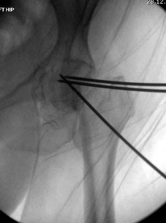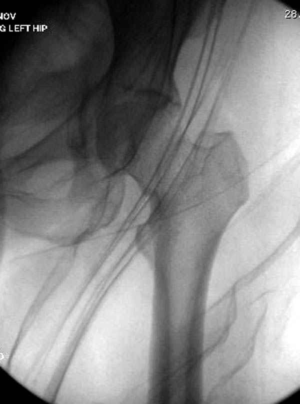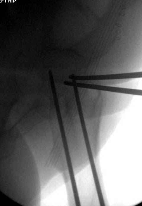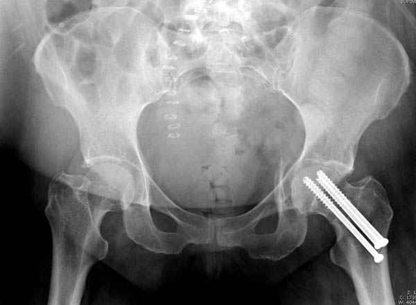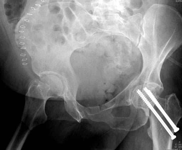 В данный момент скелетное вытяжение поучается через перелом шейки, а фиксированный перелом шейки будет участвовать в процессе вытяжения через каннюлированные шурупы.