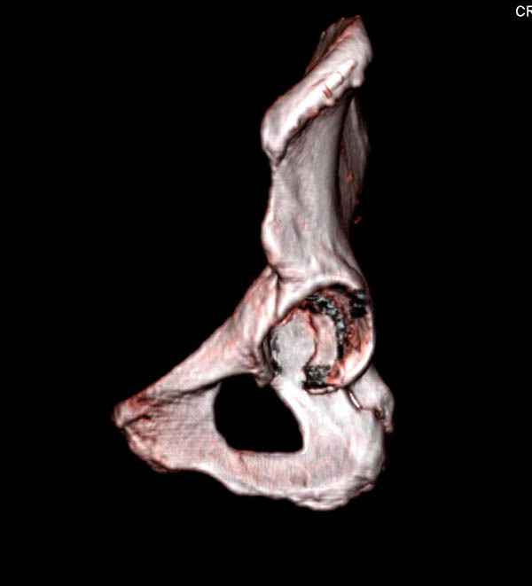 На снимке ацетабулума редко встречающийся очень низкий перелом, наверное, трудно было репозицию через один доступ? Перелом как бы замкнулся в квадрилатеральной поврехности.