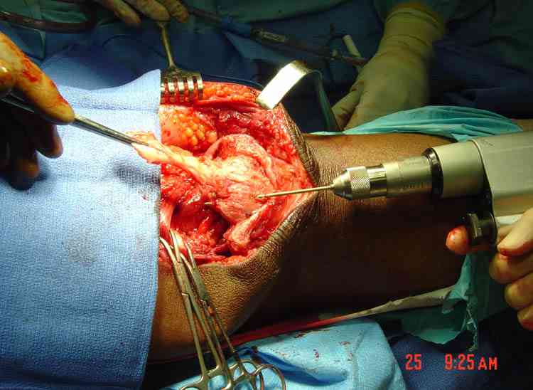 Проксимально выводим в середине связки, далее нити проводятся через предварительно сделанные паралельные туннели (2.5 мм сверлом), завязываются на верхнем участке надколенника в разгибании. Количество туннели зависит от количества швов, на одно больше, крайние одиночные, а серединные можно пропустить по две нитки сразу.