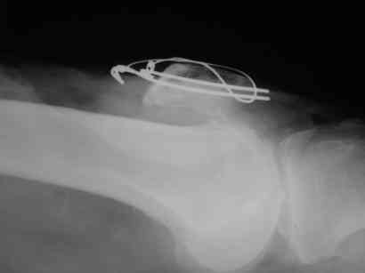 В приложении фото пациента с переломом надколенника 3 месячной давности. После мобилизации отломков, 4 главой мышцы бедра и полного разгибания голени оставался диастаз между костными фрагментами в 2 см. В связи с этим наложили модуль из аппарата Илизарова - 2 опоры и 2 спицы (в верхнем полюсе надколенника и верхней трети большеберцовой кости). Очень медленно (в течение 15 минут) путем накручивания гаек на стержнях растянули 4 главую мышцу бедра и устранили диастаз. Аппарат демонтировали и выполнили остеосинтез <стягивающей петлей>. Через 6 месяцев фиксаторы удалены. Автор данного <хирургического трюка> профессор из Австрии Vilmos Vecsei (<Гений ортопедии>, 2004, № 4, С. 94-95). Ваш случай не совсем идентичный по давности травмы и малой величине дистального отломка, но описанный <трюк> может оказаться полезным и при выполнении операции, которую рекомендует Джолдас.