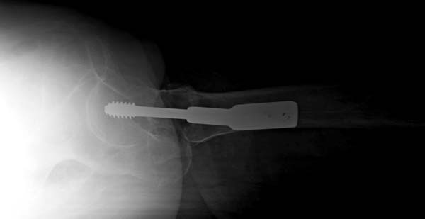 При отсутствии DHS тогда можно применить 130 градусную Г-образную пластину, вводимый угол разрешит скольжение, но для установки необходимы специальные инструменты.